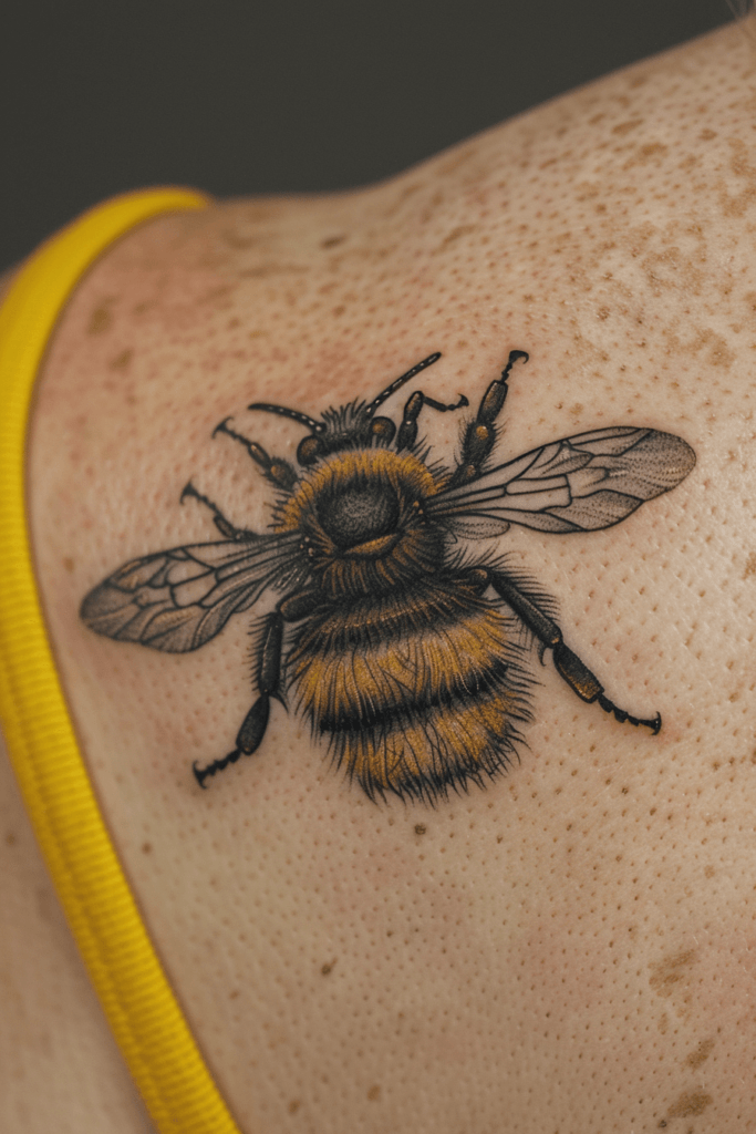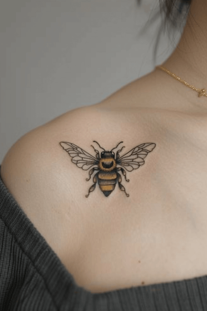 I find this tattoo impressive due to its realistic approach and delicate placement. The shoulder is a perfect spot for showcasing the bee s wingspan, adding elegance to the overall look. It s an excellent choice for those who appreciate detailed and nature-inspired tattoos.