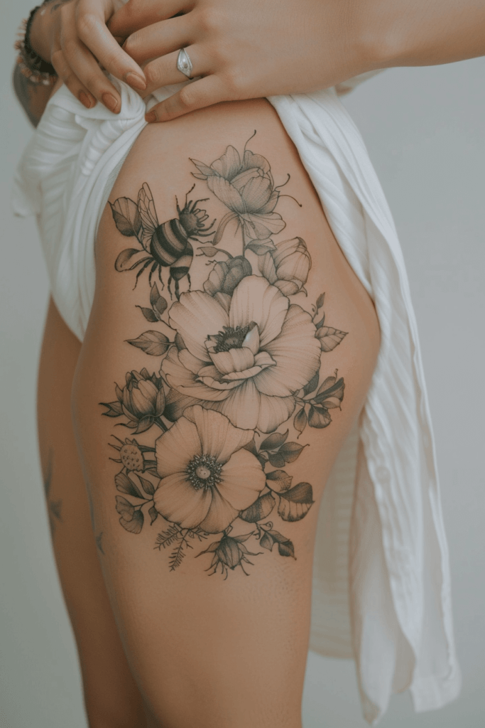 I think this tattoo is impressive because of its size and intricate details. The thigh placement allows for a larger canvas, making it perfect for a detailed design like this. The combination of flowers and the bee creates a harmonious and natural look, ideal for nature lovers who appreciate detailed, artistic tattoos.