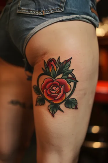 This gorgeous thigh tattoo features a fiery red rose blooming right in the center of a heart-shaped frame. The petals fade from deep red to soft orange, with bold black outlines that make the colors pop like crazy. Lush green leaves peek out from all sides, grounding the piece with that signature American traditional style. It s classic, eye-catching, and just the right size to make a statement without going over the top.