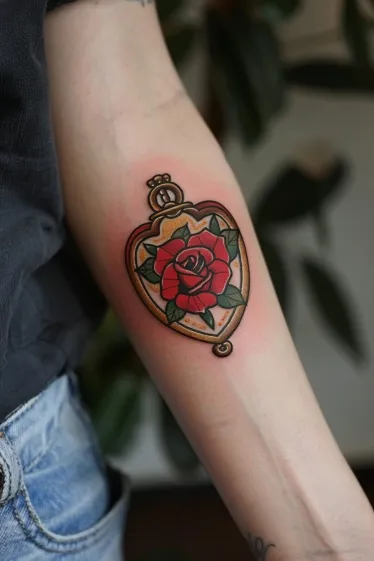 This sweet forearm tattoo features a heart-shaped locket design with a bold red rose blooming right at its center. The locket frame is done in soft golds and browns, giving it a vintage jewelry-box vibe, while the rose adds that pop of romance and color. Thick black outlines and rich shading keep it true to classic American traditional style. It s centered perfectly on the arm, making it feel like a precious keepsake you never have to take off.