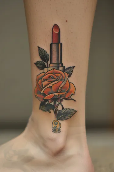 This ankle tattoo brings together two total icons of feminine energy in one brilliant design. A bold red lipstick rises straight through the middle of a blooming orange rose, with deep green leaves curling around the tube. At the bottom, a tiny lightbulb dangles from the stem like a charm, adding a playful and unexpected touch. Thick black outlines and smooth shading give it that classic American traditional punch while still feeling super fresh.