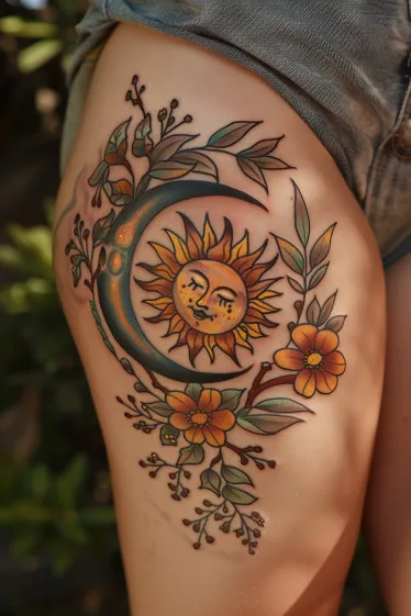 Girly American Traditional Sun and Moon Thigh Tattoo
