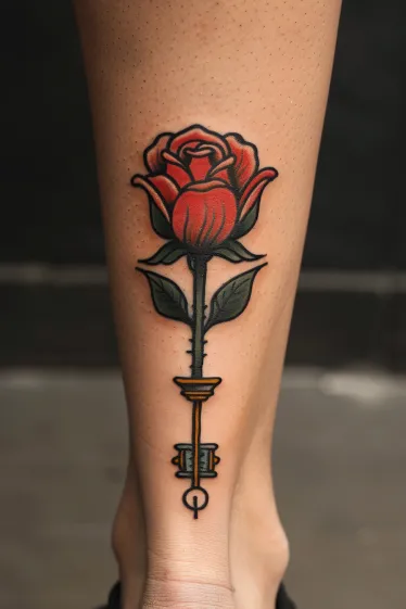 This striking calf tattoo turns a single red rose into something totally unique by blending it with the shape of a vintage key. The rose blossoms at the top with bold red petals and dark green leaves, while the stem transforms into the shaft of the key, complete with a little ornamental detail near the base. Thick black outlines and smooth shading give it that strong American traditional look, while the concept feels full of hidden meaning.
