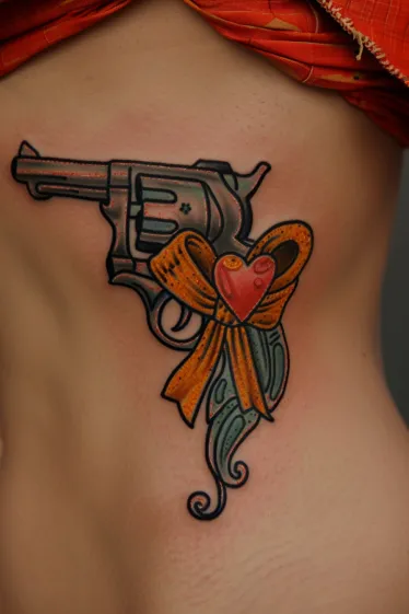 This side tattoo brings some serious sass with a tough-meets-sweet combo. It features a classic revolver in bold American traditional style, complete with thick black lines and solid shading. But the real twist is the oversized orange ribbon tied right over the handle, with a heart at the center and flowing teal accents that add a little glam to the grit. It s giving total tough-girl energy but still holding onto that feminine flair.