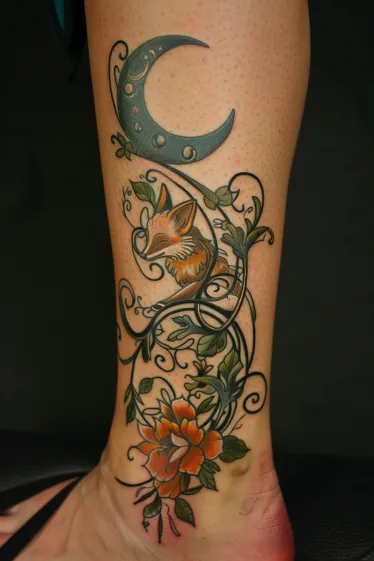 This whimsical ankle tattoo wraps around the leg like a dreamy little fairytale. At the top, there s a soft blue crescent moon with starry accents, and nestled beneath it is a curled-up fox with its eyes closed, looking peaceful and wise. Flowing vines twist and curl around the fox, leading down to a blooming orange flower at the base. The colors are rich but earthy, and the swirls give the whole piece a graceful, enchanted forest kind of vibe.