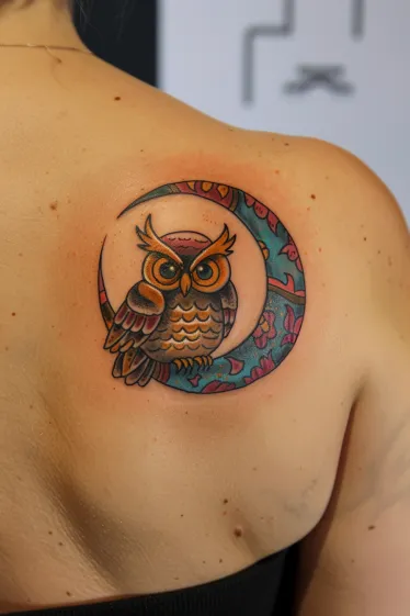 This girly American traditional tattoo features a bold and beautifully detailed owl nestled inside a crescent moon, sitting pretty on the upper shoulder blade. The owl has those classic old-school vibes with thick black outlines, warm golden browns, and piercing orange eyes that practically glow. What makes it pop even more is the moon itself, filled with teal and pink floral patterns that give the whole design a soft, feminine twist without losing that traditional edge.