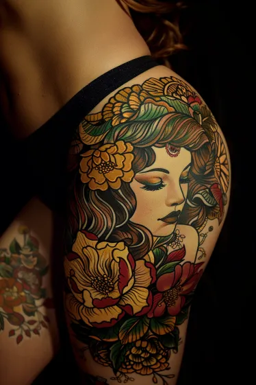 This breathtaking shoulder piece features a serene woman s face framed by a full bloom of vibrant flowers and lush leaves. Her eyes are closed, her makeup is flawless, and her hair flows in deep waves that blend right into the petals around her. Bold reds, golden yellows, and rich greens dominate the color palette, all outlined in that unmistakable American traditional black. Every little detail feels intentional, from her peaceful expression to the way the florals hug her silhouette.
