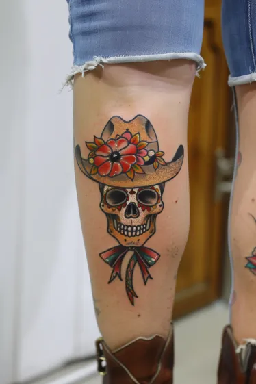 This girly American traditional tattoo is giving spooky-sweet Western realness. Placed right on the calf, it shows a smiling skull in a cowboy hat decked out with a big red flower and a pretty green-and-red ribbon tied around the neck. The bold black outlines and warm color palette stick true to the classic American traditional look, but that flower crown and cowgirl flair add just the right amount of sass. It s the perfect mix of vintage rodeo and feminine grit.