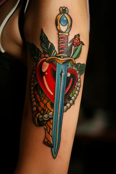 This girly American traditional tattoo is bursting with bold colors and fierce flair. It shows a gleaming blue dagger piercing a bright red heart, surrounded by lush green leaves, golden fishnet stockings, and a string of pearls that add a soft, feminine touch. There s even a little ladybug chilling on the side of the dagger, which is such a cute surprise. The placement on the upper arm gives it a strong presence, and the thick black outlines make the whole design feel classic yet powerful.