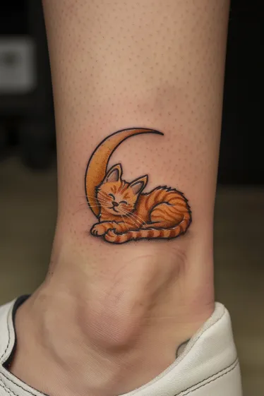 This girly American traditional tattoo is tiny, sweet, and full of cozy vibes. Tucked perfectly on the ankle, it features a little orange tabby cat curled up contently against a golden crescent moon. The soft shading, warm colors, and bold black outline keep it rooted in that timeless old-school style, but the overall look is soft and adorable. It s small enough to feel delicate, yet still stands out thanks to that classic color palette and clever composition.