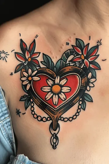 This girly American traditional tattoo is like a bouquet of love right across the chest. A rich red heart takes center stage, framed by delicate white daisies and bold red flowers, all tucked between deep green leaves. There s a touch of gold in the heart s frame and a beaded charm hanging from the bottom, which makes it feel like a piece of vintage jewelry brought to life. It s big, it s bold, and it hugs the collarbone area so perfectly that it feels like wearing a forever pendant.