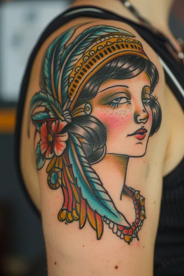 This stunning upper arm tattoo features a glamorous flapper girl in classic American traditional style. Her dark waves are tucked neatly beneath a golden headband adorned with rich turquoise feathers, a red flower, and delicate jewelry. The bold black outlines, rich reds, deep teals, and subtle blush on her cheeks give her that timeless, sassy 1920s vibe. You can also spot a string of pearls completing the look, adding just the right touch of elegance. Everything about this piece screams bold, beautiful, and unapologetically feminine.