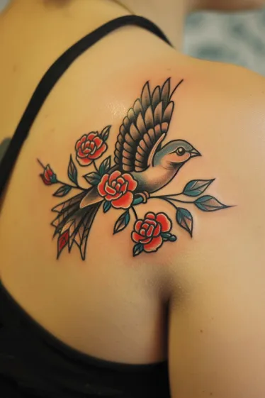 This girly American traditional tattoo features a graceful bird in mid-flight, surrounded by blooming red roses and soft green leaves. The shading is so smooth, especially in the bird s feathers, and the thick black outlines give it that bold, timeless flash look. It sits beautifully on the upper shoulder, letting the wings and flowers spread out just enough to feel balanced without being too much. The combination of the bird and florals feels classic but still totally feminine and fresh.