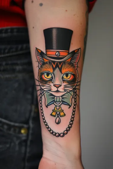This fabulous forearm tattoo features a very proper-looking cat dressed to the nines in full American traditional style. We re talking top hat, powder-blue bowtie, monocle chain, and a string of pearls. The orange, black, and white fur is brought to life with bold lines and classic shading, giving the kitty a confident, almost smug personality. Every detail pops, from the tiny glint in the eyes to the golden medallion hanging perfectly under that well-tied bow.