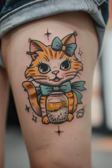 Cute Cat with Boba American Traditional Thigh Tattoo