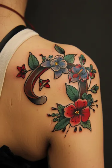 This girly American traditional tattoo is a charming little tribute to comfort and beauty. Right at the center is a classic house shoe, drawn in that bold old-school style with thick black outlines and rich brown tones. Surrounding it are bright red and soft purple flowers, tucked between leafy greens that make the whole thing feel alive and blooming. The placement on the shoulder makes it sit so naturally, almost like a little secret garden blooming from your favorite cozy memory.