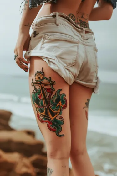 This bold thigh piece features a classic anchor wrapped in vibrant red and teal waves, all done in rich American traditional style. The anchor is shaded with deep blacks and muted golds, giving it that old-school sailor charm. Swirling waves wrap around it like a protective frame, making the whole piece feel alive with movement. It s big, confident, and perfectly placed on the outer thigh for maximum visual impact.
