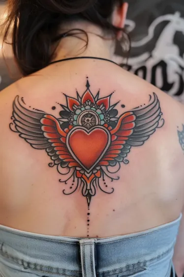 This stunning upper back tattoo is a bold celebration of love, strength, and divine vibes all in one. At the center is a radiant red heart framed in black and orange, flanked by two powerful wings stretching across the shoulder blades. Above the heart, there s an ornate mandala-style crown and a little eye-catching clock-like element, giving the whole piece a spiritual-meets-cosmic feel. Everything is drawn in classic American traditional style with thick outlines, solid shading, and those rich earthy reds and cool grays that never go out of style.