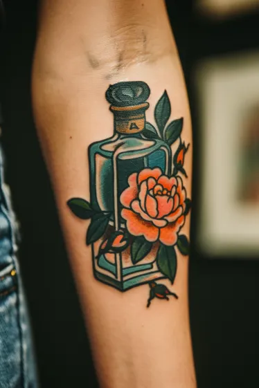 Perfume Bottle and Flower American Traditional Forearm Tattoo