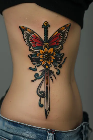 This striking rib tattoo brings together a butterfly and a dagger in the most stunning way. The butterfly wings are rich with vibrant reds, deep yellows, and touches of teal, all outlined in bold black for that true American traditional look. The dagger slices down through the center, with ornate details and a flower where the blade and wings meet. It s fierce, feminine, and beautifully balanced. The placement along the ribs makes it feel even more powerful and personal.