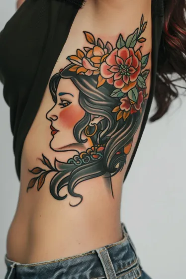 This girly American traditional tattoo is pure vintage queen energy. It stretches along the side of the ribcage, showing off a strong, elegant woman with flowing black hair and the most flawless side profile. Her hair is decorated with a bouquet of bold orange and red flowers, and she s rocking classic gold hoops and a calm, confident expression. The clean lines, saturated colors, and timeless composition make it feel like something right out of a vintage tattoo flash book, but with a modern feminine twist.