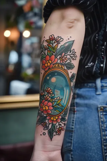This stunning forearm tattoo features an oval mirror framed in golden trim, completely surrounded by blooming flowers and leafy greenery in classic American traditional style. The mirror has a dreamy, sky-blue reflection that gives it a magical kind of glow. The flowers pop in soft shades of coral and orange, with thick black lines and rich shading that keep the whole design bold and beautifully balanced from wrist to elbow.