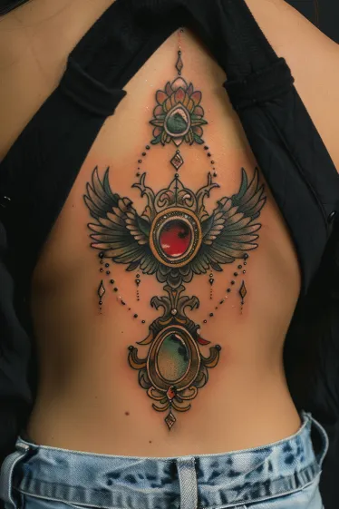 This girly American traditional tattoo is a total showstopper running right down the center of the back. At its heart are vintage-style jewels in deep red and green, all framed in ornate gold scrollwork that gives off major royal vibes. The wings branching out from the middle add this magical, almost guardian-angel feel, and the fine dotted accents and hanging jewels make it look like a piece of antique jewelry designed to move with your body. The symmetry is stunning and the placement is just perfect for turning heads in a backless dress.