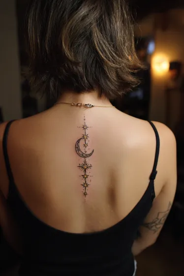 This tattoo features a delicate crescent moon surrounded by tiny glowing stars, all aligned neatly along the spine. The fine black lines give it a clean and minimal look, while the subtle golden touches in the stars add a soft shimmer that makes the design pop. The placement is simple yet eye catching, creating a celestial flow that feels both elegant and dreamy.