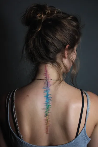 This tattoo runs straight down the spine in a vertical line of soundwave like strokes, each section filled with a different shade of the rainbow. The colors blend seamlessly from pinks and purples at the top to blues, greens, and yellows toward the bottom. It has a modern, abstract look that makes the design feel bold and artistic without being overly detailed.