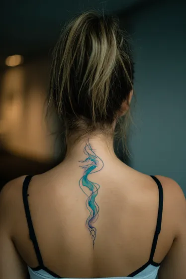 This tattoo features an elegant abstract wave flowing down the spine, painted in soft shades of teal and blue with hints of purple. The lines are thin and fluid, curling around each other in a way that looks almost like water in motion. It s minimal yet artistic, giving the back a graceful and modern design that feels light and airy.