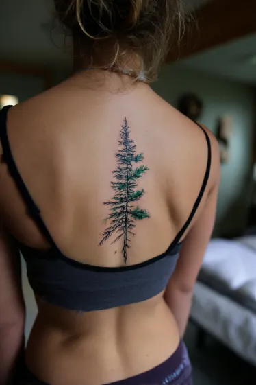 This tattoo shows a tall pine tree running along the spine, its branches detailed with fine black lines and soft green highlights. The design is long and slender, which makes it perfectly suited for the natural vertical flow of the back. The mix of sharp details in the branches with the subtle color gives it a grounded, earthy look while still feeling elegant.