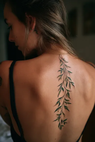 This tattoo features a graceful vine of leaves cascading down the spine, drawn in soft shades of green with delicate black outlines. The leaves are arranged naturally, almost as if they re gently swaying, giving the design a flowing and organic look. It s simple yet elegant, with the placement highlighting the natural line of the back beautifully.