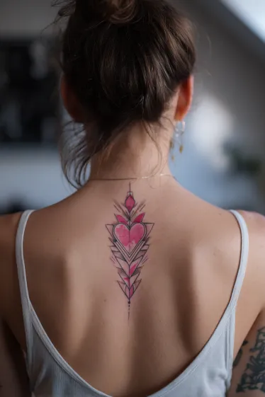 This tattoo shows a layered heart design flowing down the spine, with sharp geometric lines framing soft shades of pink. The bold symmetry gives it a striking look while the color keeps it playful and feminine. Each layer points downward in a way that naturally follows the back s shape, making it both structured and elegant at the same time.