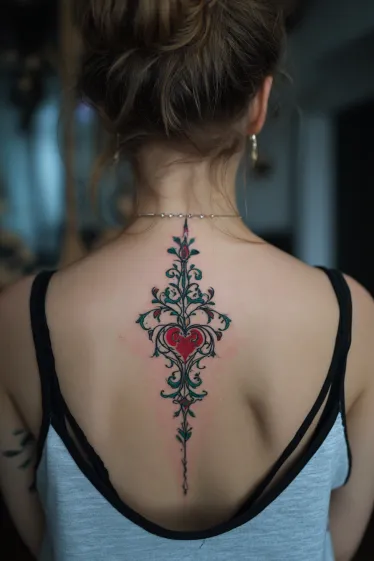 This tattoo features a decorative design flowing vertically down the spine, with a bold red heart at the center surrounded by intricate black and green ornamental patterns. The details are sharp and symmetrical, creating a design that feels both artistic and regal. The placement enhances the elegance of the spine, making it look almost like an ornate piece of jewelry etched into the skin.