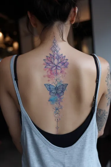 This tattoo combines a blooming lotus and a butterfly in one dreamy design that flows perfectly down the spine. The lotus sits higher up with petals in soft shades of purple and pink, while the butterfly spreads its wings below, detailed with fine black lines and hints of blue. Watercolor splashes surround the design, giving it a magical, almost ethereal feel that makes it stand out beautifully on the skin.