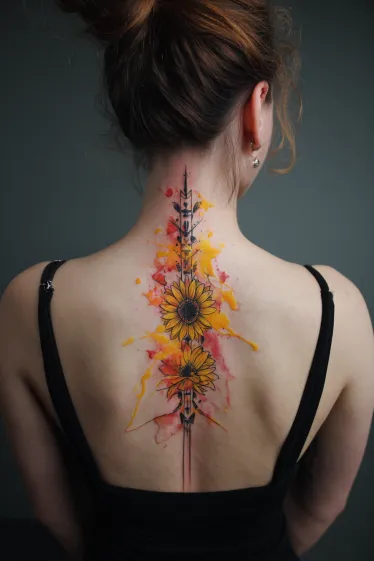 This design is a bold mix of color and nature, stretching gracefully down the spine. Bright sunflowers bloom in the center with warm yellow and orange tones, while splashes of watercolor bleed outward in fiery shades. The black linework anchors the design, giving balance to the playful colors. It feels both structured and free at the same time, which makes it stand out in the best way.