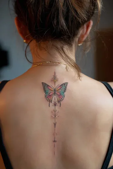 I adore this tattoo because it has such a whimsical charm. The pastel colors make it feel gentle and unique, and the way the butterfly blends with the spine line makes it look elegant without being overwhelming. If I had this, I d feel like I was carrying a little piece of fairytale magic on my back.