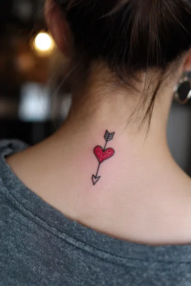 This little tattoo is the perfect mix of sweet and playful. A small red heart sits at the center with an arrow piercing through it, outlined in crisp black ink. Placed neatly at the nape of the neck, it draws attention without being too bold, making it a charming choice for anyone who loves minimalist designs with a pop of color. The simplicity is what makes it so eye catching, and the placement gives it that flirty, peekaboo effect when the hair is up.