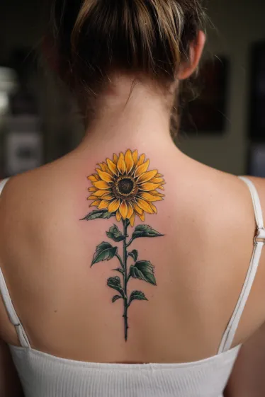 This tattoo showcases a tall sunflower placed beautifully along the spine, with bright golden petals and a detailed dark center. The stem runs straight down with bold green leaves that balance the flower s vibrant color. The design is striking yet natural, filling the back with warmth and charm while still keeping a clean, vertical flow.