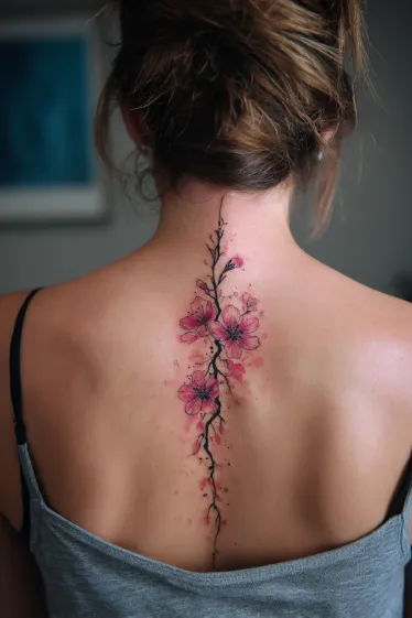 I love this tattoo because cherry blossoms always carry such a romantic and fleeting beauty. The soft pinks make it feel light and feminine, while the placement gives it that elegant touch. If I had this on my spine, I d feel like I was wearing a piece of spring year round, and honestly, that feels so dreamy to me.