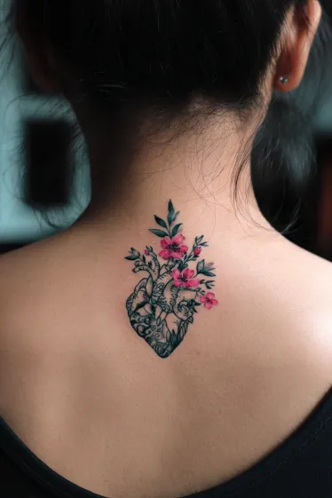 This tattoo shows an anatomical heart blooming with delicate pink flowers, placed high along the spine. The heart itself is shaded in fine black detail, giving it depth and texture, while the flowers add a burst of color that softens the whole design. The green leaves bring balance, creating a piece that feels both edgy and feminine at the same time.