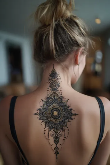 This tattoo is a breathtaking mandala design that flows perfectly along the spine. It s made up of intricate geometric patterns layered in a symmetrical way, with bold black lines and hints of gold that make the details pop. The placement emphasizes the natural curve of the back, turning it into a canvas for a piece of art that feels both delicate and powerful. Every small dot and swirl adds depth, giving it a mesmerizing look from every angle.