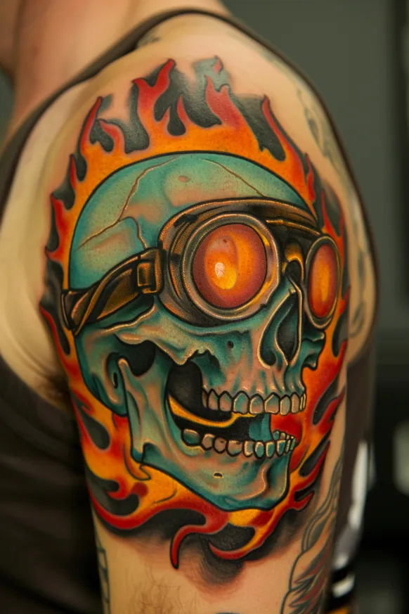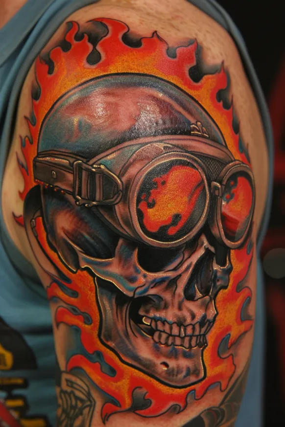 This tattoo is pure adrenaline on skin. A fiery blue skull with cracked bone details takes center stage, its intense orange goggles reflecting the open road ahead. The flames engulfing the skull are a bold mix of deep reds, bright oranges, and inky blacks, creating a sense of speed and power. The smooth shading and high-contrast highlights give it a dynamic, almost three-dimensional look. Placed on the upper arm, this piece is an absolute head-turner.