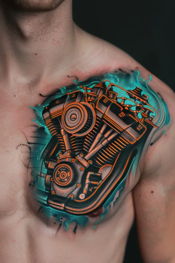 This tattoo is a mechanical masterpiece. A highly detailed V-twin motorcycle engine is inked across the chest, looking like it s embedded under the skin. The metallic silver tones and bold orange highlights give it a futuristic, almost cybernetic feel. The glowing blue accents add depth, making it look like it s pulsing with raw energy. Every bolt, piston, and gear is intricately shaded, creating a three-dimensional effect that makes it feel like a real engine is powering the wearer.