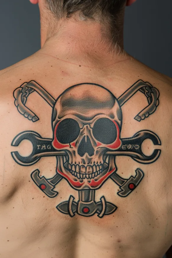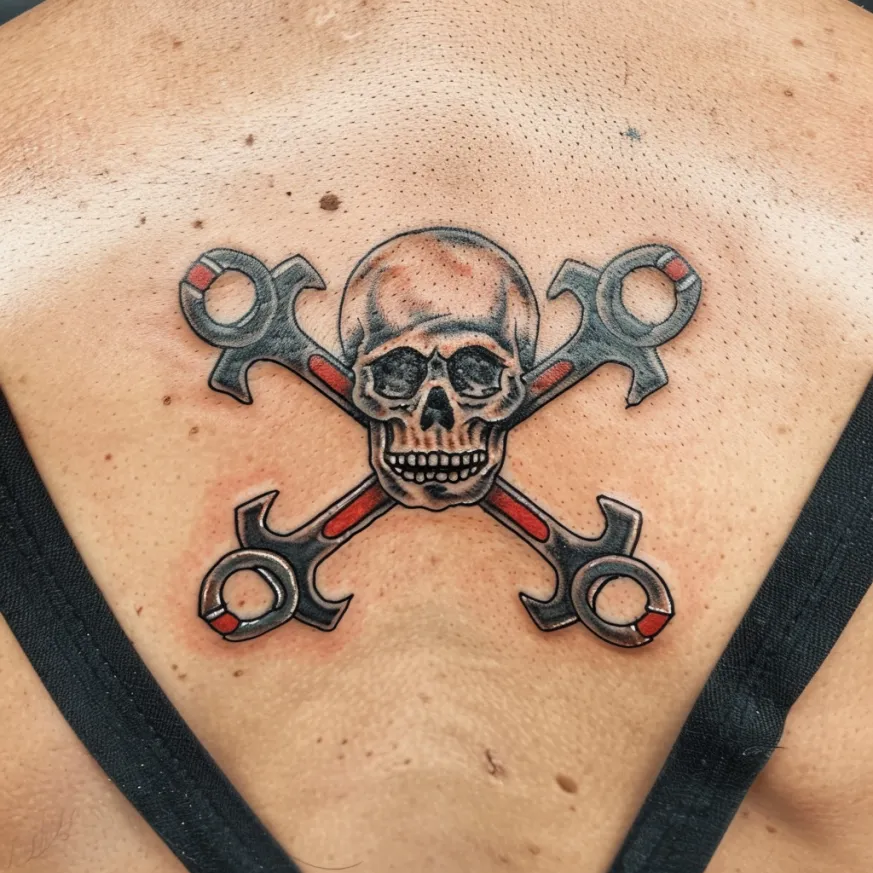 This tattoo is classic, bold, and full of biker attitude. A realistic skull sits at the center, giving off that signature rebellious energy. Instead of the traditional crossbones, two crossed wrenches add a mechanical twist, symbolizing the hands-on, grease-stained lifestyle of true motorcycle lovers. The black and grey shading adds depth, while the subtle red accents bring just the right amount of contrast. Placed perfectly on the upper back, this design is a statement piece that embodies strength, grit, and freedom.