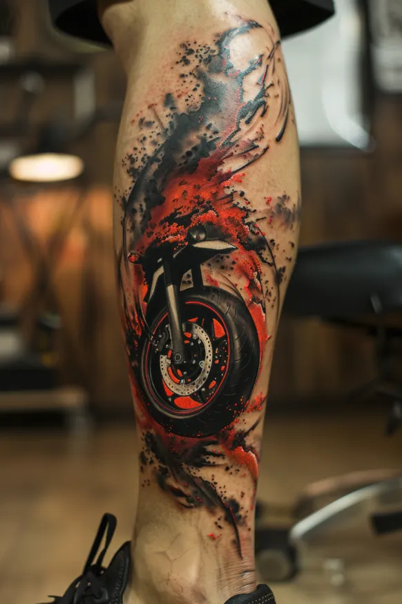 This tattoo is wild, energetic, and full of raw motion. A hyper-detailed motorcycle front wheel dominates the design, surrounded by an explosion of red and black ink splashes, giving it a stunning watercolor effect. The sharp contrasts and chaotic paint strokes make it feel like the bike is tearing through the skin at high speed. The realistic shading on the tire and the metallic shine on the brake disc make it pop right off the skin. Placed on the calf, this piece is a pure adrenaline rush in tattoo form.