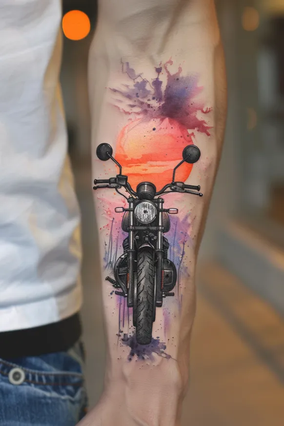 This tattoo blends bold realism with artistic expression. A detailed black motorcycle takes center stage, its chrome details and handlebars meticulously inked. Behind it, a vibrant watercolor explosion of oranges, purples, and reds creates the illusion of a blazing sunset and motion trails, making the design feel alive with energy. The soft, flowing colors contrast beautifully against the sharp, realistic details of the bike, giving it a dreamy, almost cinematic effect.