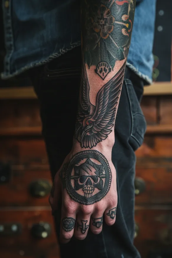 I can t get over how badass this entire piece looks. The placement is perfect, making the skull a bold focal point while the eagle adds a seamless flow up the arm. The way the shading enhances the depth gives it a timeless, gritty charm. There s something about a hand tattoo that just feels extra fearless, and this one? Pure biker attitude.