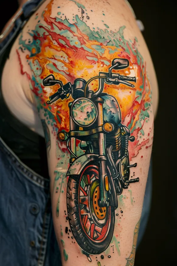 This tattoo is an explosion of color and movement, capturing the thrill of the ride in the most artistic way possible. A detailed motorcycle takes center stage, inked with bold outlines and intricate shading, making it feel almost three-dimensional. Surrounding it, fiery splashes of red, orange, yellow, and teal create a dramatic watercolor effect, adding an electric sense of motion. The placement on the upper arm makes it a striking piece that feels both free-spirited and full of energy.