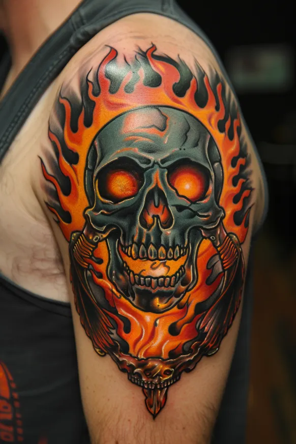 This bold and fiery shoulder tattoo takes the classic biker skull to another level. The glowing red eyes give it an intense, almost supernatural stare, while the blackened skull surrounded by bright orange flames makes it look like it s rising straight from the underworld. The intricate details in the shading and texture make the skull pop with a hyper-realistic touch, and the sharp wing-like embellishments add a touch of gothic badassery.